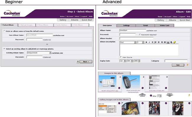 Cachelan offers two ways that allow a user of any skill level to use the product effectively. Quickstart mode takes a beginner through a step-by-step process to get an album on the internet in minimal time using default settings. The Advanced mode allows experienced users to customize their album with the many templates and settings available. Tutorials are available for users in the advanced mode that will get their online albums running exactly as they had envisioned. The next few slides show the process of creating an online album in the advanced mode.